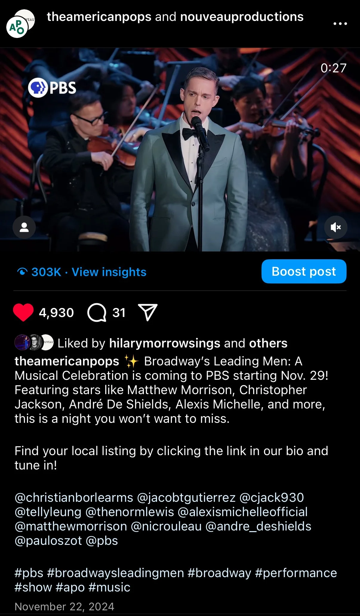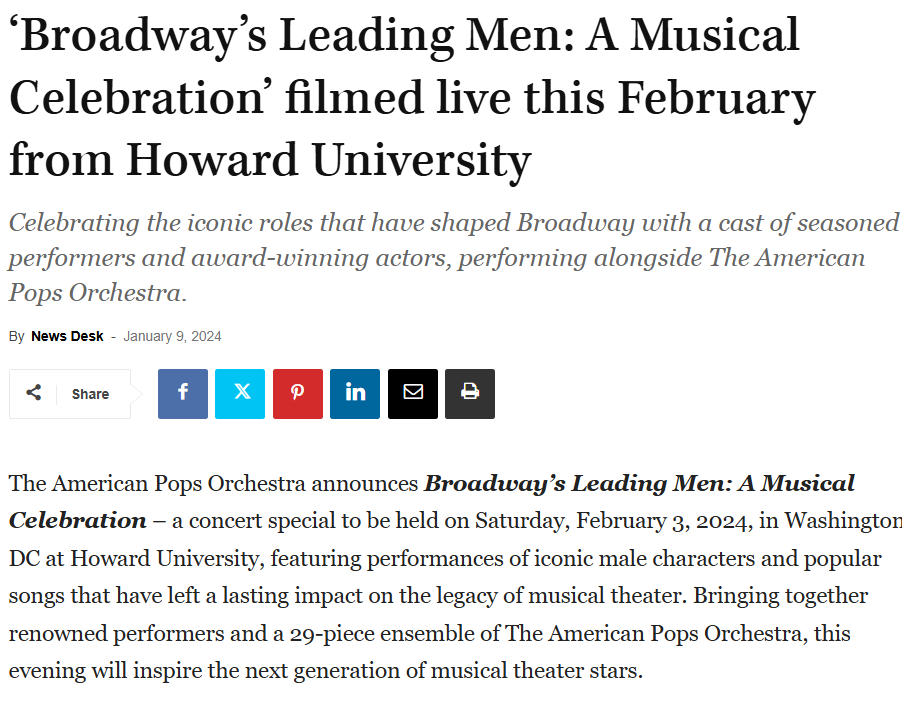 As the part-time Marketing & Outreach Coordinator, I led paid advertising and assisted in social media efforts for The American Pops Orchestra’s Broadway’s Leading Men, a live concert featuring Broadway stars Christopher Jackson, Christian Borle, and Norm Lewis.